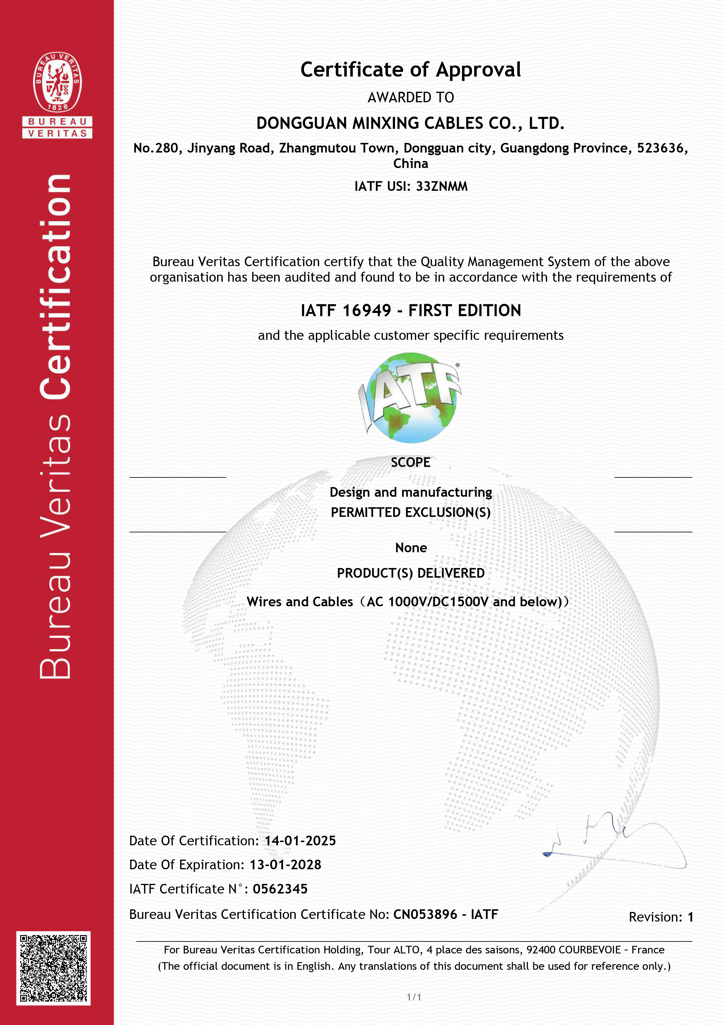 2025剛開年,民興電纜就喜報頻傳。這不,繼入選中國民航機場助航燈光系統(tǒng)合格供應商后,近日,民興電纜又成功取得IATF 16949汽車行業(yè)質(zhì)量管理體系認證證書,意味著其獲得了進入汽車行業(yè)供應鏈的通行證,能夠為全球汽車行業(yè)提供質(zhì)量可靠、安全穩(wěn)定的高品質(zhì)產(chǎn)品與服務,助力全球汽車行業(yè)供應鏈高質(zhì)量發(fā)展。